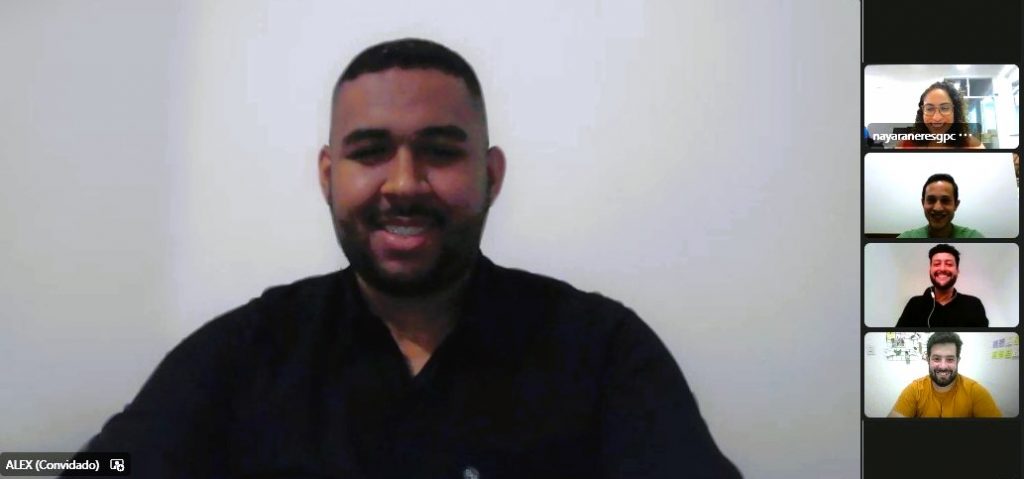 Na foto, da esquerda para a direita, de cima para baixo, Alex Junio Santos Silva (Orientando), Prof.ª Nayara Aparecida Neres da Silva (Membro da banca examinadora- UFOP), Prof. Erriston Campos Amaral (Membro da banca examinadora), Prof. Matheus Mello Pereira (Orientador) Prof. Douglas Geraldo Magalhães (Coorientador).