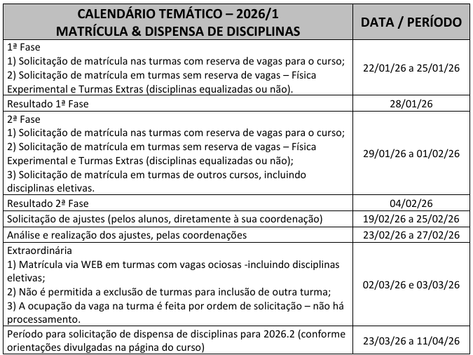 Se atente às informações disponibilizadas pela Coordenação de Curso no grupo de aviso da Engenharia Metalúrgica e em seu e-mail.